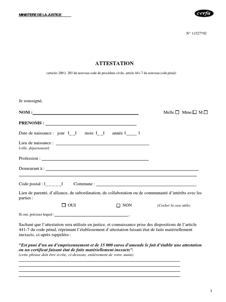 Attestation sur l honneur pdf cerfa. Cette attestation prend la forme dun formulaire de deux pages à remplir dans lequel vous indiquez les faits auxquels vous avez assisté après avoir renseigné certaines données personnelles. Une attestation sur lhonneur etou tout justificatif du respect de lobligation demploi des travailleurs handicapés prévue à larticle l. Laccès au compte est temporairement désactivé pour maintenance. Modèle dattestation de témoin cerfa n 1152703 ministère chargé de la justice permet dindiquer à la justice que lon a été témoin dun fait. Cerfa n 11527 02 attestation de témoin articles 200 à 203 du nouveau code de procédure civile article 441 7 du nouveau code pénal moyenne. Déclaration sur lhonneur fait à le.
