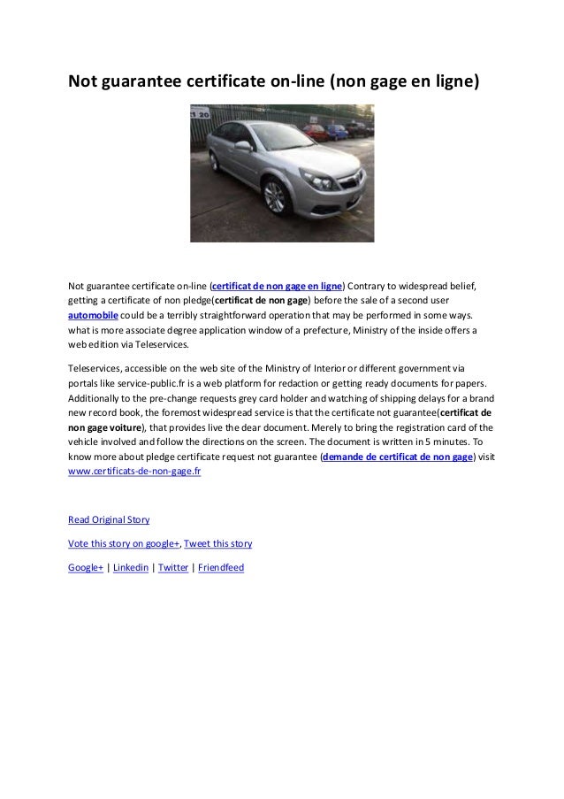 Certificat de non gage en ligne. Nécessité dun certificat de non gage. Obtenir un certificat de non gage pour savoir si une particularité ou un événement empêche la vente du véhicule. Cette offre ne consiste donc pas dans la vente dun certificat de non gage que lutilisateur peut par ailleurs obtenir auprès du site officiel de létat mais dans la prise en charge par certificats non gagefr pour le compte de lutilisateur. Accéder au service en ligne nouvelle fenêtre. Vous serez alertée par courriel dès que la page certificat de situation administrative non gage et non opposition sera mise à jour. Votre abonnement a bien été pris en compte.