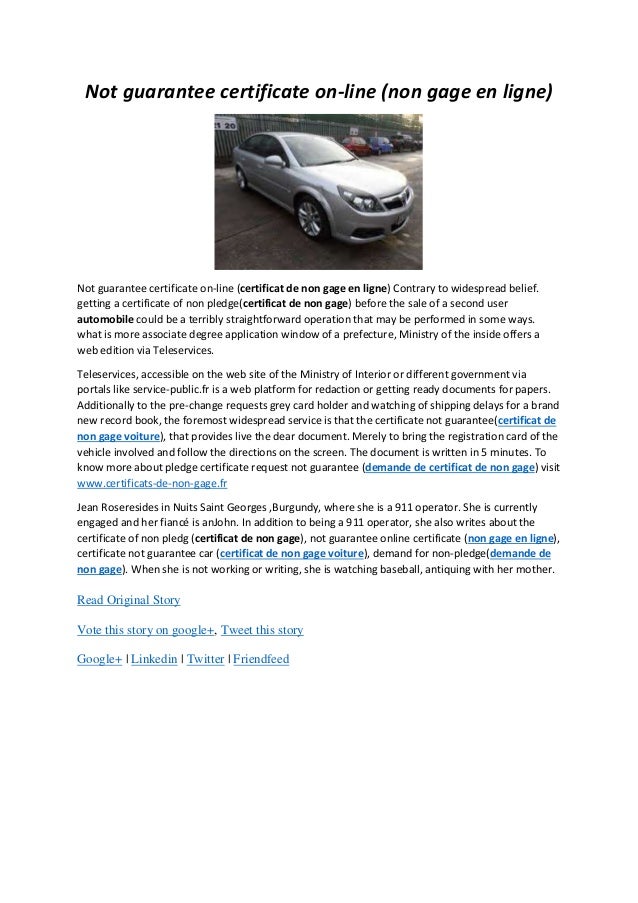 Certificate de non gage. Cicgcca la proposition de résolution comprend également lautorisation à conférer dans le cadre de la modification des statuts aux membres du conseil dadministration ainsi quaux avocats et paralégaux de de brauw. Identification du certificat dimmatriculation. Vous devez vous munir du certificat dimmatriculation ci pour trouver les informations particulières relatives à votre véhicule. Vous pouvez obtenir de laide en cliquant sur les champs marqués par sont à renseigner obligatoirement. Le document doit. Le certificat de non gage certificat de situation administrative est un document que le vendeur doit fournir à lacheteur au moment de la vente dune voiture doccasion.