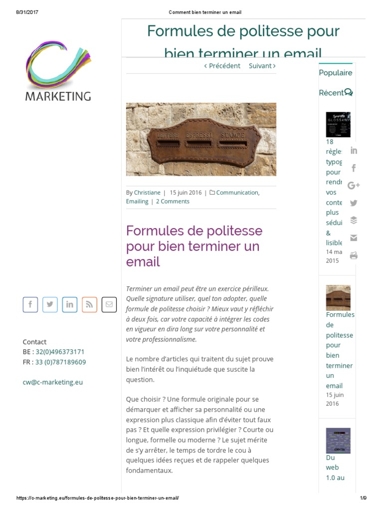 Comment terminer un mail. Comment finir un e mail de la bonne manière. Il est important de faire attention aux derniers mots car ils seront retenus par le destinataire. Selon le destinataire la formule de fin sera différente. La formule de politesse est elle nécessaire dans un mail. Risques de contresens de formulations maladroites de calques de langlais sur. Il convient bien sûr dadapter le titre au destinataire.