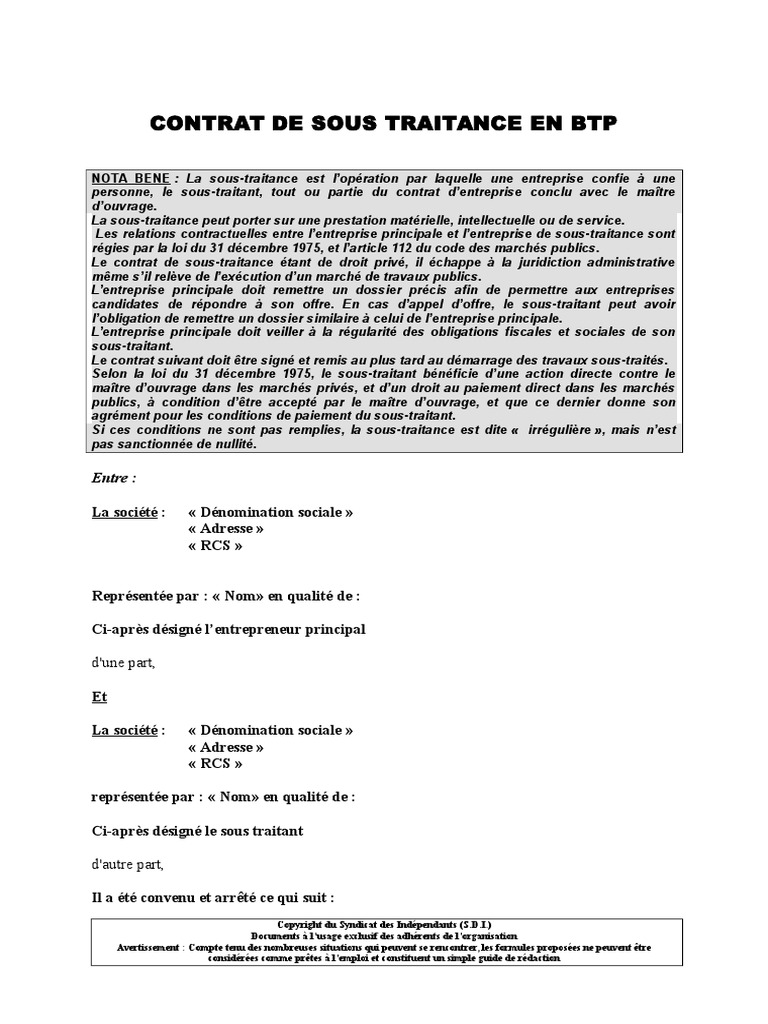 Le contrat de sous traitance encadre une opération entre deux entreprises lune qui est le donneur dordre et lautre qui est le sous traitant. Un contrat de sous traitance pour la construction dun ouvrage notamment dans le domaine public a des dispositions particulières et très différentes du marché privé. à lissue de cette période initiale ce contrat serra renouvelé par périodes consécutives dun an et pourra être dénoncé avec un préavis de nombre de mois mois. Notre document vous permet de sécuriser vos relations afin de travailler ensemble sereinement. Le contrat de sous traitance fait lobjet dun écrit sous seing privé et un projet de contrat est généralement établi durant les négociations. Utilisez notre contrat de sous traitance pour encadrer les relations entre lentrepreneur principal et le sous traitant.