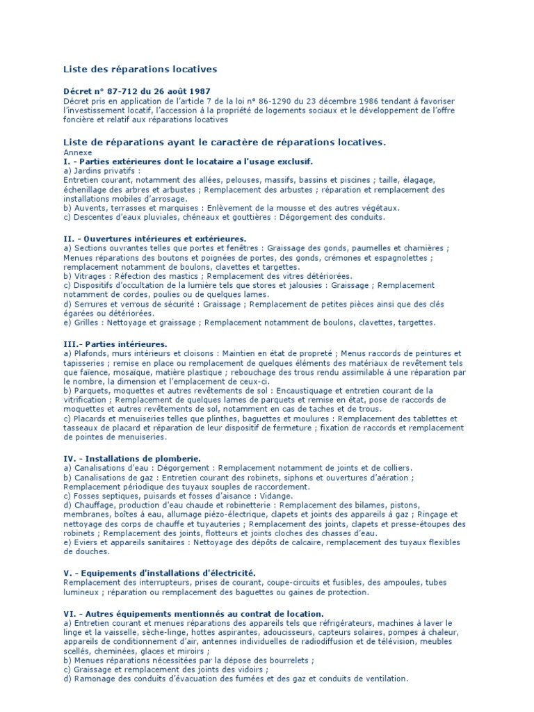 D cret n 87 712 du 26 ao t 1987. Il sagit du décret nº 87 712 du 26 août 1987 qui énumère une liste non limitative de ces réparations locatives. Décret n87 712 du 26 août 1987 pris en application de larticle 7 de la loi n 86 1290 du 23 décembre 1986 tendant à favoriser linvestissement locatif laccession à la propriété de logements sociaux et le développement de loffre foncière et relatif aux réparations locatives nor. Décret n87 713 du 26 août 1987 pris en application de larticle 18 de la loi n 86 1290 du 23 décembre 1986 tendant à favoriser linvestissement locatif laccession à la propriété de logements sociaux et le développement de loffre foncière et fixant la liste des charges récupérables nor. Le décret n87 712 du 26 août 1987 définit les réparations locatives. Article 7 obligation dentretien du locataire article 7d décret n87 712 du 26 août 1987 favorisant la location. Propriétaires locataires découvrez la liste complète des réparations locatives en 2019 daprès le décret 87 712 du 26 août 1987.