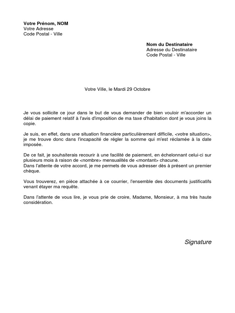 Ainsi la jurisprudence constante de la deuxième chambre civile de la cour de cassation en date du 4 octobre 2001 n 00 11609 na jamais été remise en cause. Une demande de délai de paiement impliquerait de remettre en cause la validité du paiement dores et déjà effectué ce qui est impossible et contraire au texte. Pour transformer votre modèle de lettre demande de délai de paiement pour une facture en pdf utilisez le logiciel de traitement de texte gratuit libreoffice ou openoffice qui permet de faire directement la conversion de word à pdf. Une lettre de demande de délai de paiement de vos impôts peut être envoyée à votre centre des impôts si vous ne pouvez pas payer le montant indiqué sur votre avis dimposition. Tout contribuable peut solliciter une demande de délai de paiement dimpôts si sa situation le justifie. Délais de traitement de la demande.