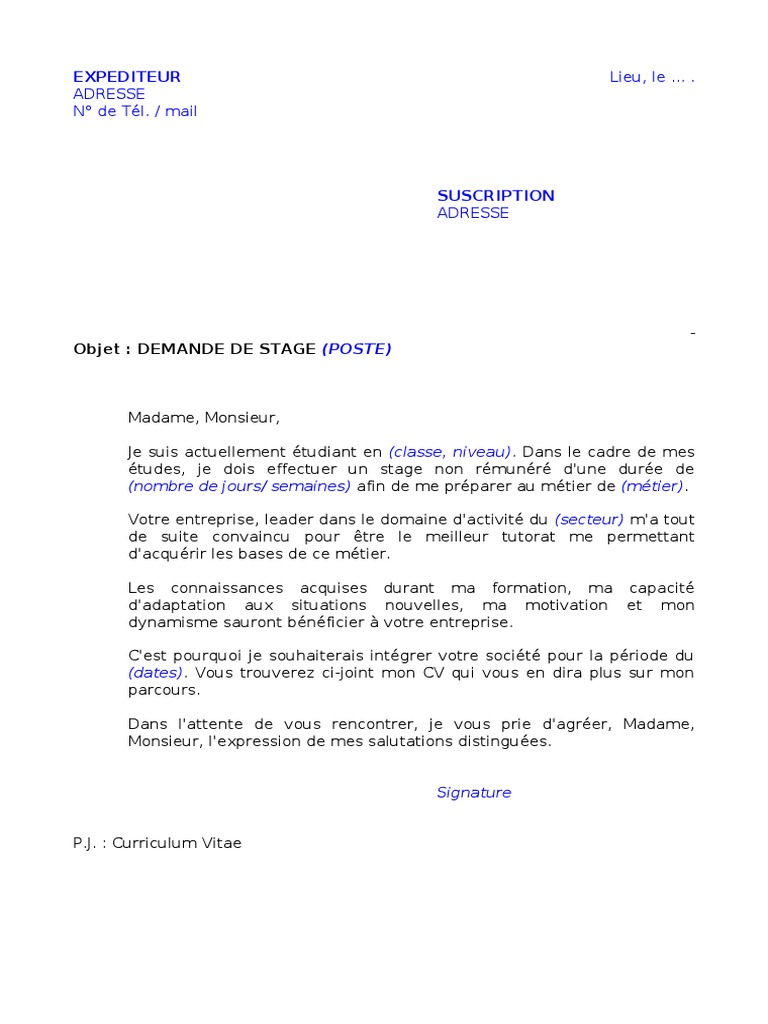 Vos prénom et nom votre adresse mail à. Si vous voyez une annonce de stage ou que vous souhaitiez vous informer. Nom du responsable des stages objet. Noubliez de personnaliser ce courrier avec vos informations en remplaçant le texte entre parenthèses. Davance je vous. Voici un modèle de lettre de motivation pour faire une demande de stagevous pouvez le télécharger au format word pour le modifier dans un logiciel de traitement de texte afin de lenvoyer par courrier.