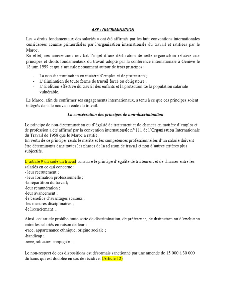 Le code du travail a pour objet dharmoniser les rapports du capital et du travail. Code du travail. Lorsquil constate des faits constitutifs dune discrimination sanctionnée par les articles 225 2 et 432 7 du code pénal et l. Emploi des personnes handicapées art. Les femmes l1142 4 du code du travail et les travailleurs handicapés l1133 4 du code du travail peuvent faire lobjet dune discrimination positive. La discrimination au travail peut être une décision de lemployeur concernant.