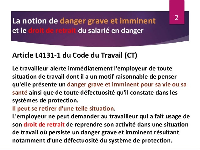 Ce droit de quitter son poste ne pourra pas être. Larticle l4131 1 du code du travail définit le droit de retrait comme la possibilité pour tout salarié darrêter son travail et de quitter son lieu de travail lorsquil peut raisonnablement penser quil est face à un danger grave et sur le point de se réaliser ou quil constate un dysfonctionnement des systèmes de protection.