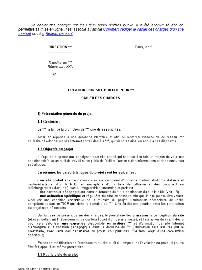 Il sera par la suite transmis pour servir de base au cahier des charges technique qui traduit les besoins fonctionnels en spécifications techniques. Dans cet article sont résumées les 7 recommandations qui vous permettront détablir un cahier des charges pertinent pratique et efficace dans le cadre dun appel doffres. Notre modèle et exemple cahier des charges de création dun site catalogue vous servira de base pour lancez votre catalogue de produit en ligne et vous fera grimper votre chiffre daffaires. Néanmoins la rédaction dun cahier des charges efficace vous évitera des dépassements budgétaires de délai et dobtenir un produit différent de vos besoins. Un cahier des charges a pour fonction de formaliser un besoin afin que ce dernier soit compris par lensemble des acteurs impliqués dans le projet. Définition du cdc un petit rappel pour commencer.