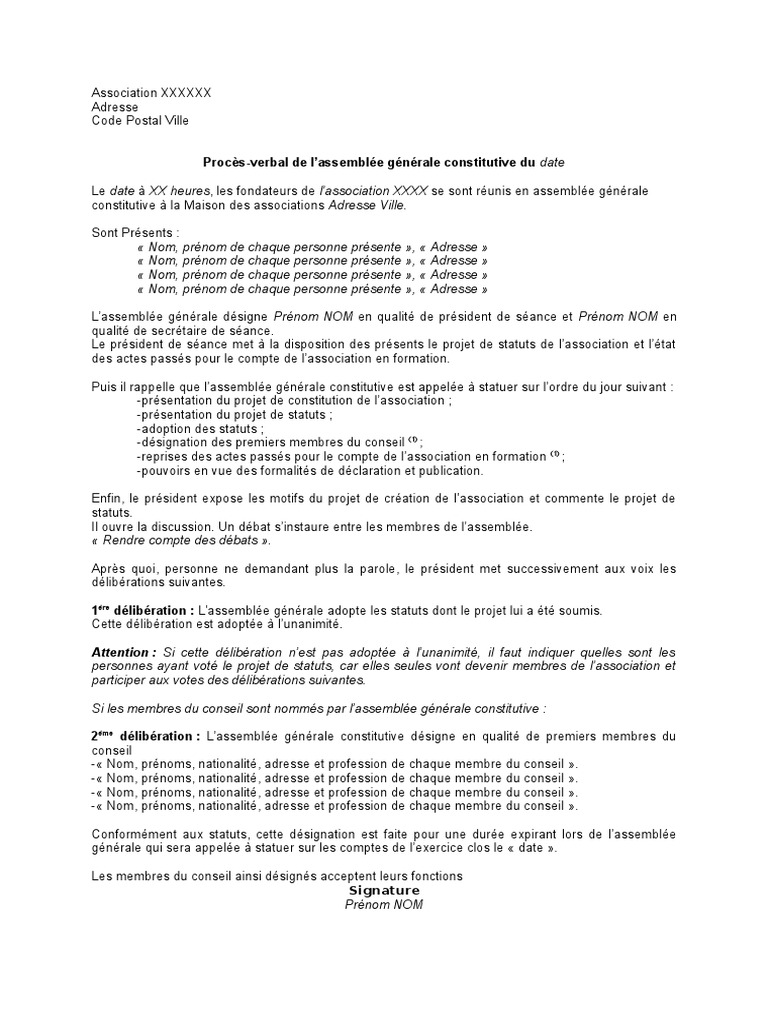 Les membres de lassociation se sont réunis en assemblée au siège de lassociation. Il a été établi une feuille de présence signée par chaque membre du bureau entrant en séance ci annexée. Modèle de procès verbal de lassemblée générale constitutive de lassociation en tête dénomination sociale de lassociation association à but non lucratif de droit français régie par la loi du 1er juillet 1901 adresse du siège social procès verbal. à ce propos le procès verbal dune association pour le changement de son bureau par exemple peut présenter le rapport complet des propositions faites à la séance. Les membres du bureau de lassociation nom de lassociation se sont réunis le date de la réunion à heure de la réunion au lieu de la réunion sur convocation préalablement adressée par lettre recommandée ar remise en main propre. Lassemblée générale est présidée par et est convoquée conformément aux dispositions inscrites dans les statuts de lassociation.