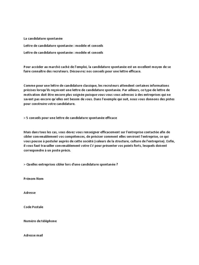 Lettre de motivation candidature spontanée guide exemple lettre de motivation candidature spontanée guide exemple écrire une lettre de candidature spontanée est bien plus complexe que pour une candidature classique. La lettre de candidature a une grande importance lors dune recherche demploi. Lettre de motivation. Télécharge gratuitement cet exemple de lettre de motivation pour une candidature spontanée et modifie le avec wordlettre gratuite facile à modifier. Voici comment créer une opportunité et se faire embaucher sans offre demploi. Adaptez le et complétez les propos en fonction de votre situation personnelle.