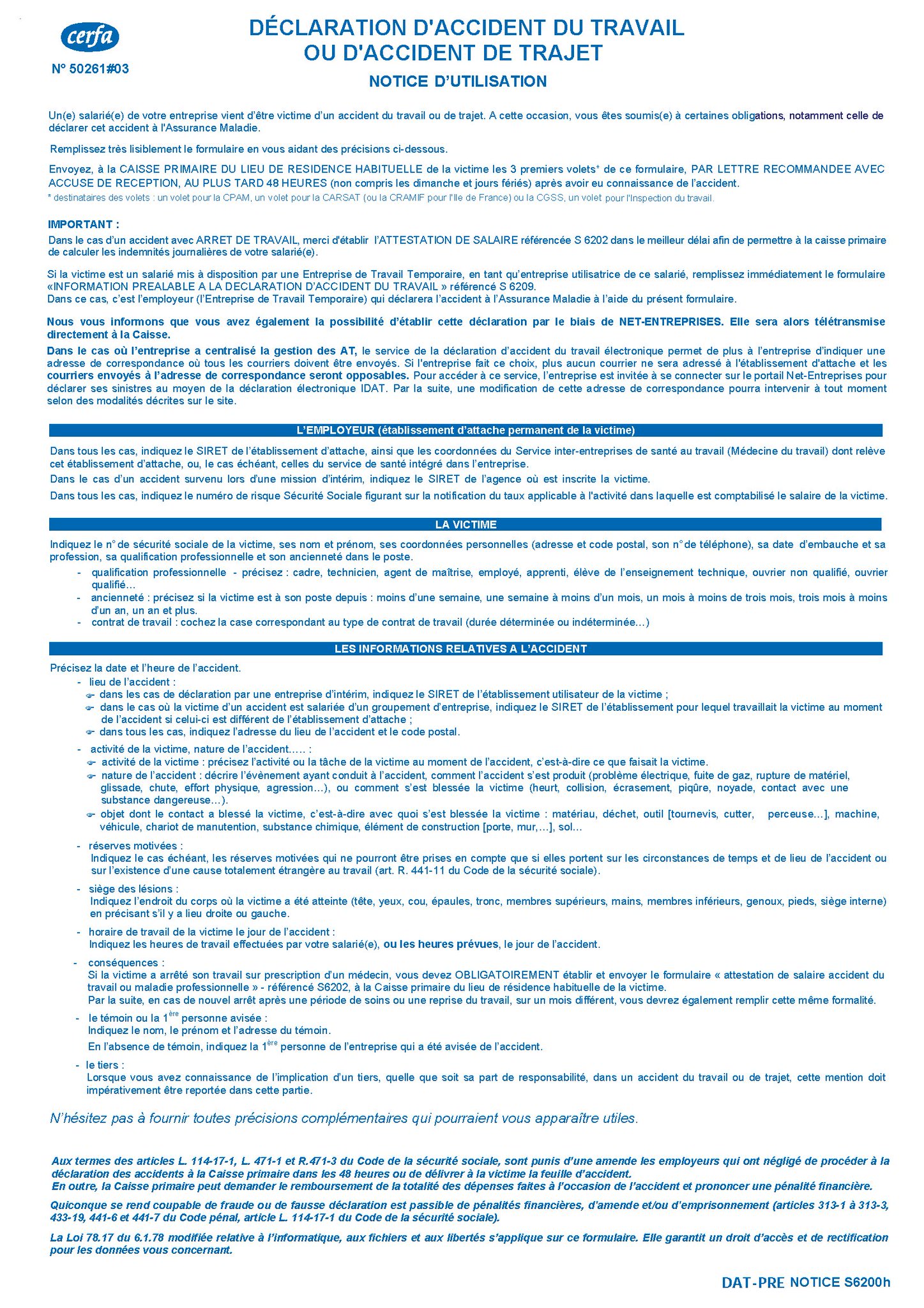 Formulaire accident de travail. Vous avez 48h pour remplir et envoyer ce formulaire cerfa 14463 de déclaration daccident du travail dat si vous êtes employeur et que lun de vos salariés vient dêtre victime dun accident du travail ou dun accident de trajetce document doit être imprimé puis rempli en trois exemplaires à la cpam du salarié. Si la victime a arrêté son travail sur prescription dun médecin vous devez obligatoirement établir et envoyer le formulaire attestation de salaire accident du travail ou maladie professionnelle référencé s6202 à la caisse primaire du lieu de résidence habituelle de la victime. Gardez tous vos reçus. A noter que si laccident a eu lieu pendant les heures de travail et sur le lieu de travail cet accident est présumé être imputable à lactivité professionnelle assurée. Ce formulaire téléchargeable peut comporter des obstacles à laccessibilité. Remplissez le formulaire réclamation du travailleur.