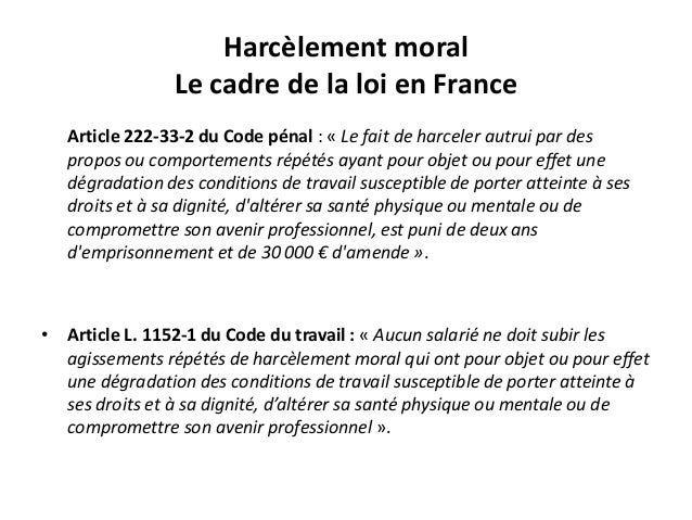 Toutefois le texte laisse apparaître quil se compose de deux éléments. Un élément matériel le comportement de harcèlement affectant la tranquillité dune personne et un élément moral savoir ou devoir savoir les conséquences de son comportement. Modifié par loi n2014 873 du 4 août 2014 art. Il sagit dun acte répété par lequel lauteur tient des propos ou agit dans le but de nuire à sa victime physiquement ou moralement. Cet article définit le harcèlement moral et précise les sanctions applicables. Le texte de larticle 222 33 2 du code pénal est affiché dans les lieux de travail.
