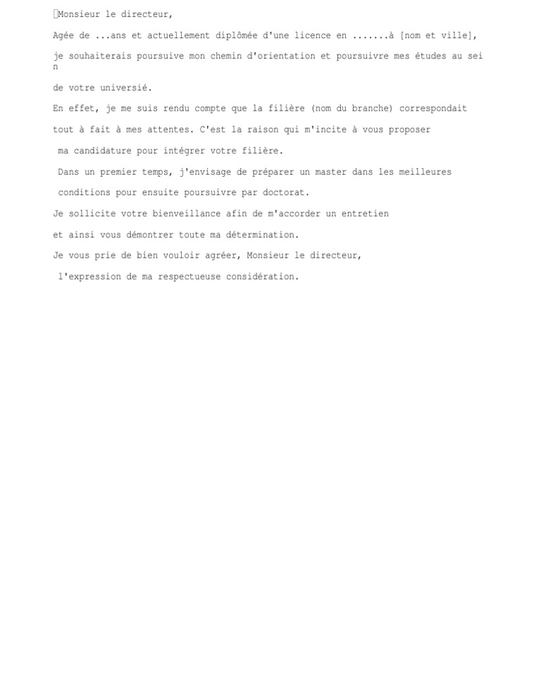 Jai lhonneur de venir par la présente demande solliciter votre haute bienveillance de bien vouloir maccorder la possibilité de postuler. Jai lhonneur de soumettre à votre bienveillant examen. Il a sollicité une entrevue.