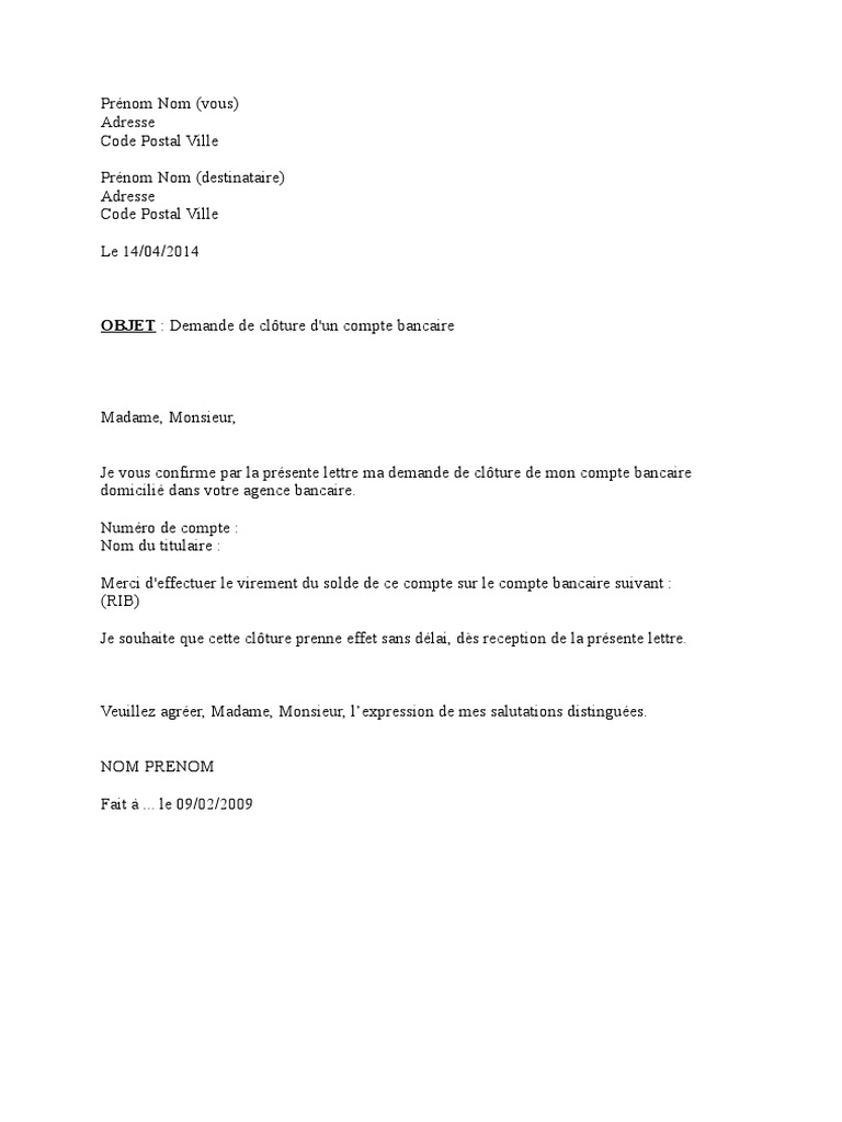 Lettre de clôture de compte bancaire. La lettre de clôture dun compte nest pas encadrée juridiquement mais vous pouvez y faire figurer plusieurs informations importantes. Indiquer le numéro du compte bancaire à clôturer madame monsieur je tiens à vous informer par la présente de ma volonté de clôturer mon compte bancaire n xxx indiquer le numéro du compte bancaire détenu au sein de votre. La clôture dun compte bancaire peut être effectuée à linitiative de son titulaire ou de létablissement bancaire. Sil est débiteur le client doit régulariser sa situation avant de clôturer le compte. A la date de fermeture je vous remercie de bien vouloir madresser un relevé de compte détaillé.