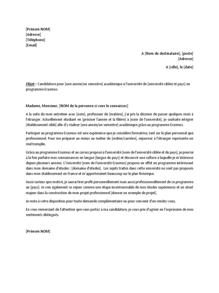Vous verrez que rédiger une lettre de motivation pour un erasmus est un exercice très simple. Publié le 26 février 2018 par justine debret. Lettre de motivation erasmus. Modèle de lettre de motivation pour demande bourse erasmus participer au programme erasmus est lune des expériences les plus enrichissantes quun étudiant puisse avoir la chance de vivre. Voici deux exemples de lettre de motivation erasmus. Dans la lettre de motivation erasmus plus vous devez insister sur le fait que vous partagez les mêmes valeurs que ce programme européen en mentionnant des mots clés pertinents.