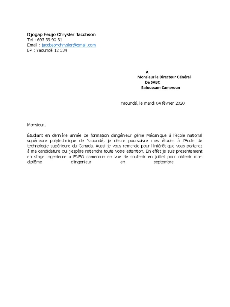 Lettre de motivation débutant lettre de motivation candidature spontanée lettre de motivation bureau détudes conseil rd lettre de motivation industrie ingénieure en mécanique soyez le premier a donner votre avis sur la lettre de motivation ingénieur. Actuellement en cinquième année dingénieur à zzzz je suis à la recherche dun stage de fin détudes de 6 mois et plus précisément un stage qui concerne la gestion de projet. Madame monsieur étudiant en dernière année de formation dingénieur génie civil en école dingénieur je dois effectuer un stage dans le domaine de la construction afin de valider mes études et ce serait pour moi un honneur de le réaliser au sein de votre prestigieuse entreprise. La lettre de motivation ingénieur est un exercice de style il faut en réaliser de nombreuses avant den comprendre les codes. Opter pour une structure infaillible. Voici un exemple dune lettre de motivation ingénieur sur lequel vous pouvez vous appuyer.