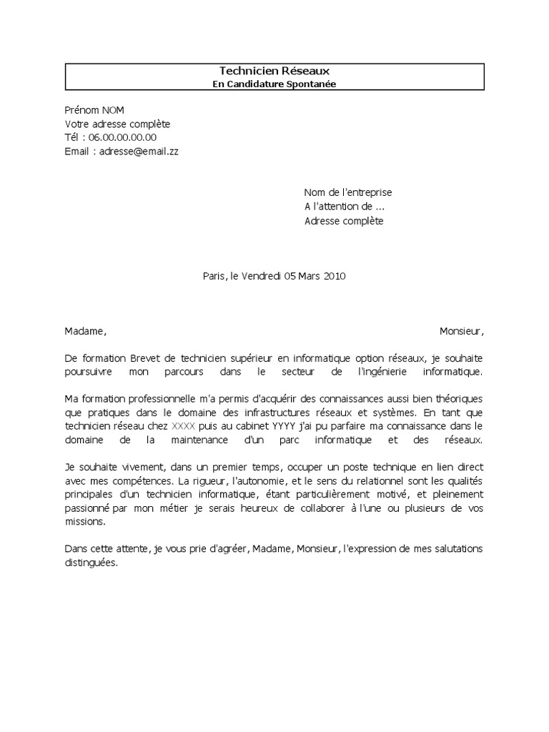 Lettre de motivation technicien informatique. Titre de votre correspondant. Le modèle de lettre de motivation pour un technicien de maintenance que nous vous proposons devra être développé selon votre profil. Technicien informatique en candidature spontanée lettre de motivation pour une demande de stage. Technicien de maintenance informatique technicien de maintenance technicien bâtiment technicien bureau détudes. Le à ville nom de lentreprise. Détecter lorigine du dysfonctionnement et intervenir pour résoudre le problème.