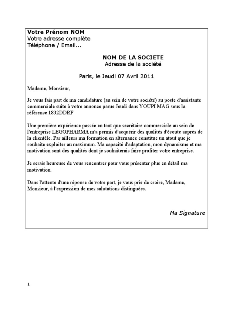 Lettre motivation assistante commerciale. Madame monsieur cest avec honneur que je vous fais parvenir ma candidature pour le poste dassistante administrative et commerciale suite à votre annonce parue récemment vu que je corresponds au profil. Récemment diplômé du bac pro gestion administration jai été formé aux responsabilités liées à lexercice de la fonction dassistant commercial. Candidature au poste dassistante commerciale. Lettre de motivation assistante commerciale réponse à une annonce sénior. Madame monsieur fort dune première expérience en tant quassistant commercial je me permets de vous soumettre ma candidature afin doccuper un poste similaire au sein de votre entreprise. Madame monsieur ayant validé ma première année de bachelor international business au sein de pôle paris alternance en vue de préparer un mastère international business et pour la poursuite de mon cursus en deuxième année je suis à la recherche dun poste de business developerassistante commerciale et marketing en contrat de professionnalisation pour 20xx20yy 2 jours d.