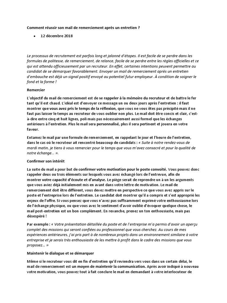 Quel mail envoyer après un entretien dembauche nous vous. Voici un exemple de mail de remerciement à envoyer suite à un entretien dembauche. Il est recommandé décrire avec votre cœur et de reprendre des points abordés lors de lentretien. Pour être réussi ce mail devra être concis simple et cohérent avec le rendez vous que vous venez davoir. Modèle gratuit demail de remerciement après un entretien dembauche. Lentretien dembauche ne sarrête pas à la porte de lentreprise.