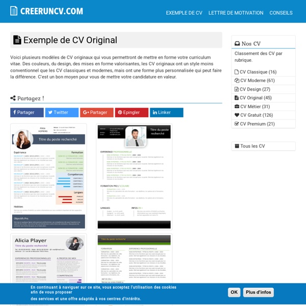 Cv original 72 cv métier 35 cv gratuit 225 cv premium 25 tous les cv. Exemple de cv original voici plusieurs modèles de cv originaux qui vous permettront de mettre en forme votre curriculum vitae. Cv gratuit vous cherchez un emploi et vous avez besoin dun modèle de cv. Un modèle de cv original est parfait pour attirer lattention du recruteur et ainsi faire la différence. Téléchargez nos modèles de cv gratuits. Ces modèles de curriculum vitae sont prêts à lemploi il ne vous reste alors plus quà les compléter et à les adapter selon votre profil.