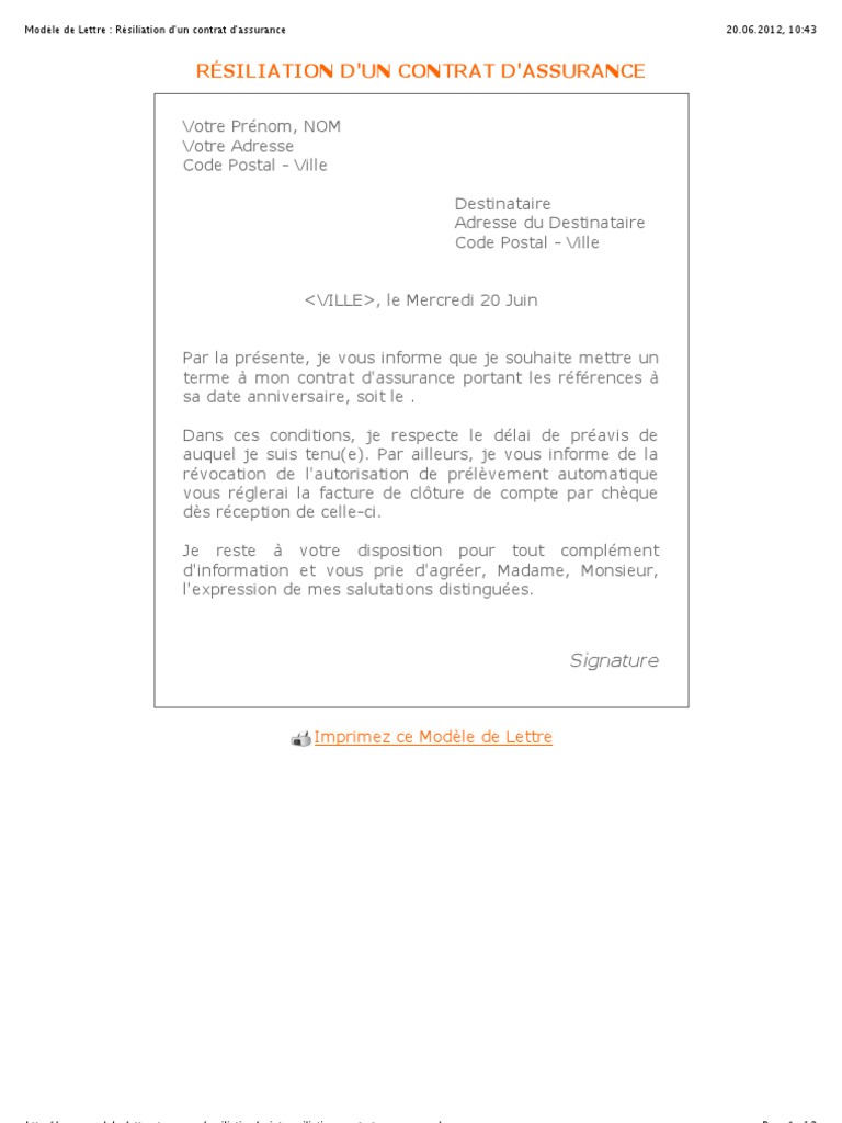 Mod le de lettre de r siliation de contrat d assurances. Voici un modèle de lettre gratuit dont le sujet est lettre de résiliation de contrat dassurance obsèques décès. Afin de résilier le contrat dassurance auto qui le lie à une compagnie dassurances lassuré doit impérativement adresser une demande de résiliation à cette dernière. Je vous prie également de bien vouloir me faire parvenir simultanément à la confirmation de cette résiliation de la part de vos services la facture de clôture de mon contrat dassurance avec la mention de la date effective de cette résiliation. Lassureur comme lassuré peut résilier un contrat à léchéance sauf en assurance maladie. La résiliation prend effet un mois après que lassureur en a reçu notification par lassuré par lettre ou tout autre support durable. Conformément à larticle l.