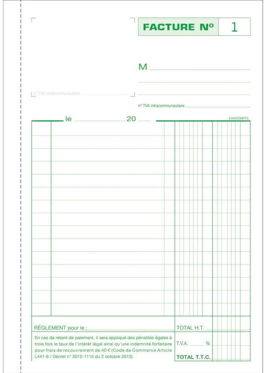 La facture est un document commercial qui reprend les conditions convenues dune vente mais aussi la preuve juridique de lexistence de lachat dun bien ou dune prestation de serviceelle est la matérialisation comptable dune créance et sert de support au calcul de la tva lorsquelle est éligible. La facture est dans ce cas destinée à un client professionnel puisque les pénalités de retard et les frais de recouvrement sont mentionnés. Il faut savoir que certains produits et certaines activités professionnelles ou transactions sont exemptés de lapplication de la taxe sur la valeur ajoutée. Exonération de tva. Exonération tva art. Hormis le point concernant la tva ce type de facture est similaire à toute autre facture.