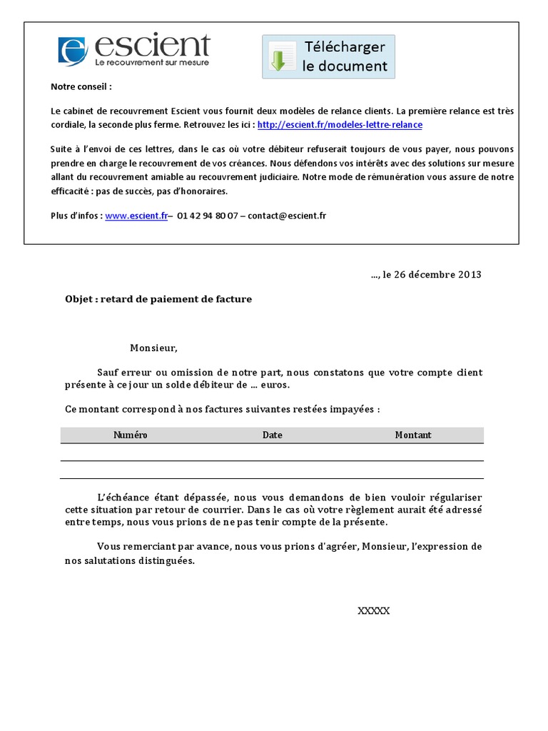 Modele lettre de relance. Il sagit dadresser à votre client un courrier dans lequel vous lui rappelez ses obligations à votre égard. Envoyer une 2ème lettre de relance pour facture impayée. Toutes nos lettres de relance sont gratuites et permettent de relancer vos clients par courrier ou mail. Sachez que si vous avez lhabitude de communiquer avec votre client par courriel il pourrait percevoir cette lettre comme une démarche solennelle alors que son retard de paiement est peut être dû à. Envoyer une 3ème lettre de relance. Un bon suivi des.