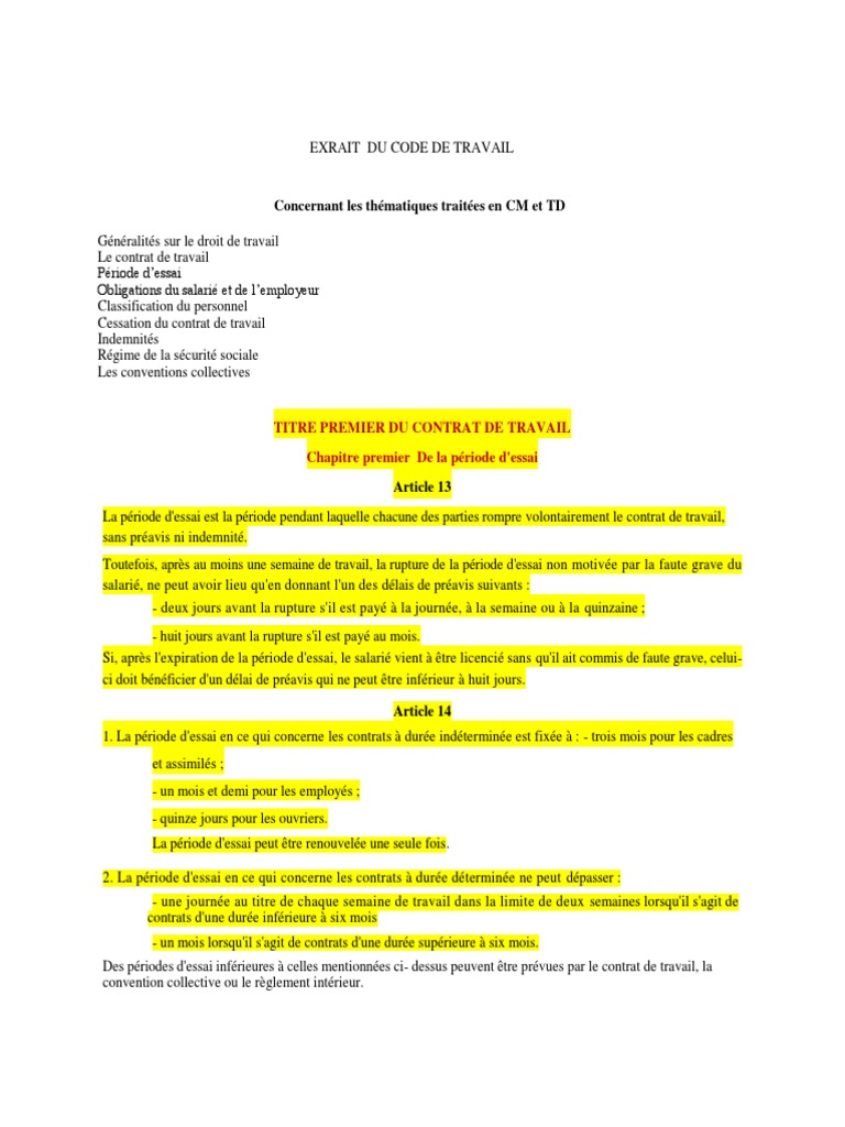 La période dessai est une période probatoire se situant au début de lexécution dun contrat de travail à durée indéterminée ou déterminée. De plusieurs semaines à plusieurs mois la période dessai est variable selon le type de contrat sa durée et le type demploi. Ce dernier doit alors suivre quelques règles parmi lesquelles figurent la nécessité de prévenir le. La période dessai viendra ou non par la suite confirmer lembauche. La partie souhaitant résilier le contrat de travail doit respecter un préavis qui dépend de la durée initiale. Durant cette période lemployeur et le salarié peuvent rompre rapidement et sans indemnité le contrat de travail.