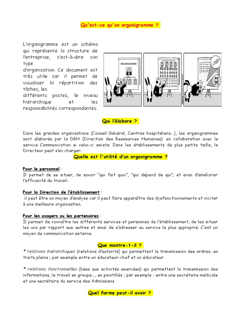 Il ne donne que peu dinformations en ce qui concerne la répartition des tâches qui sont décrites dans des définitions de fonction ces définitions de fonction sont rattachées à lorganigramme par une référence. Quest ce quun organigramme. Quest ce quun organigramme. Utilité de lorganigramme pour un projet. Quest ce quun organigramme. Ils sont largement utilisés dans de multiples domaines pour documenter étudier planifier améliorer et faire partager des processus souvent complexes ainsi transposés dans des schémas clairs et faciles à comprendre.