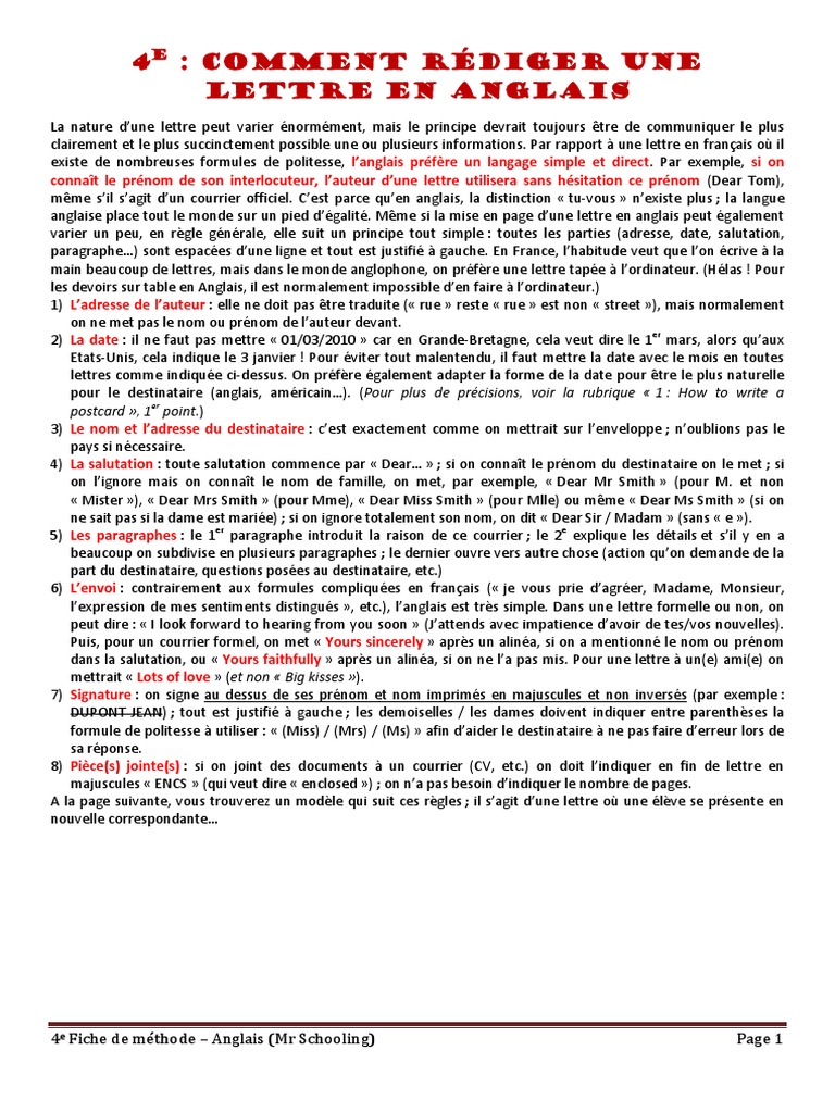 R diger une lettre en anglais. Vous pouvez même rédiger une lettre sadressant au défunt. Voici un guide méthodologique pour que vous puissiez rédiger une lettre de motivation en anglais cover letter parfaite et trouver un emploi ou stage de rêve dans un pays. Rédiger une lettre formelle cours. Lettre de motivation en anglais. Thank you for your letter of may 28th. 1 on écrit son adresse dans le coin en haut à droite.