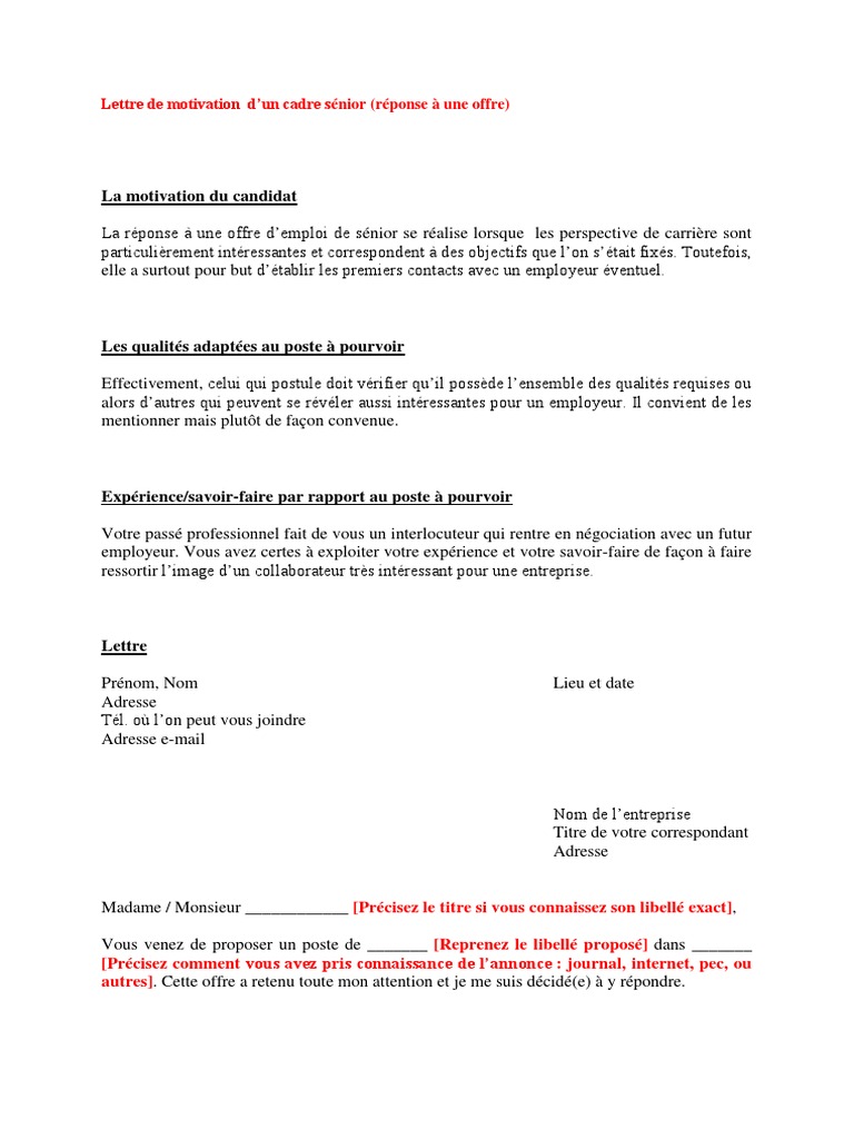 R ponse offre d emploi. Mon parcours ma permis dacquérir une expertise solide dans lanalyse des postes du bilan et dans la mise en œuvre dactions vraiment adaptées à la réalisation des budgets. Votre réponse à loffre demploi est votre lettre de motivation cest aussi votre carte de visite qui vous permet de décrocher un emploi. Réponse à loffre demploi n précisez la référence madame monsieur suite à lannonce que vous avez publiée dans précisez le support je vous propose ma candidature. Joccupe actuellement un poste de précisez dans une entreprise de précisez. Exemple de lettre de motivation réponse à une offre demploi. Votre nom votre adresse votre ville état code postal votre numéro de téléphone votre email.
