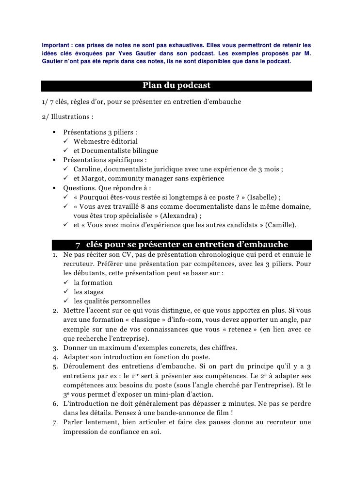 Yves gautier est coach cv et coach emploi spécialiste de lentretien dembauche de motivation et de la préparation à loral de concours. Comment réaliser votre pitch. Lors dun entretien dembauche le recruteur vous demande toujours de vous présentervous devez vous décrire de façon succincte et précise afin de mettre en avant vos expériences et votre motivation. Bac s l3 stage à londres etc et de faire les liens ensuite à loral pour que ça ne ressemble pas à une poésie. Donner une bonne poignée de main bien ferme se souvenir du nom de la personne qui vous reçoit être positif et parler amicalement. En définitive noubliez pas quun entretien réussi est un entretien où à la fin de la journée votre employeur se souvient de vous de limpression que vous lui avez faite.