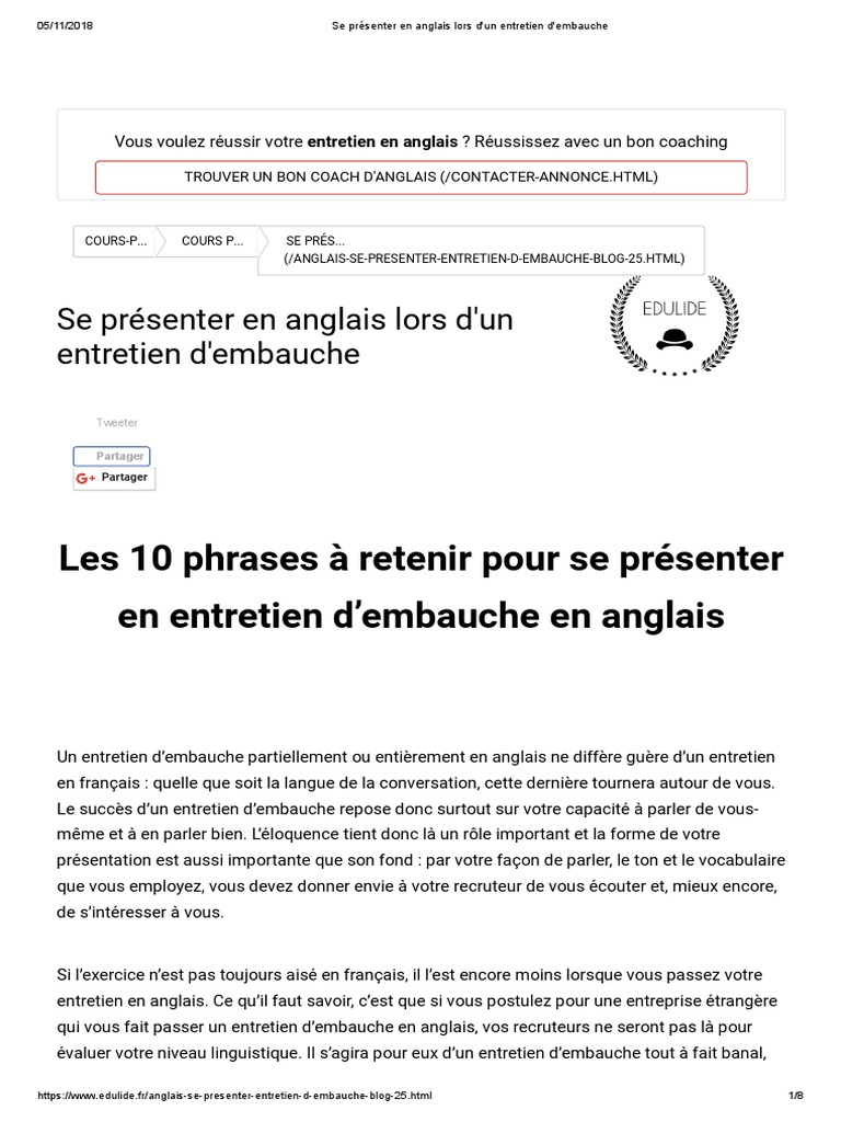Comment se présenter en anglais professionnel. Il vous donne des conseils pour réussir votre. Comment se présenter en 5 minutes lors dun entretien dembauche. Une chose est sûre.