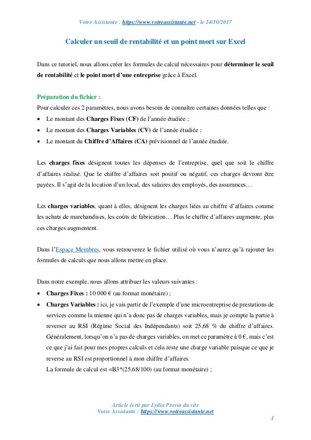 Calcul du seuil de rentabilité pour une profession libérale. Impossible sachant quil y a déjà 10 000 de cf et 4 62240 de cv. Rappel de la formule. Seuil de rentabilité charges fixes taux de. Quant au taux si je ne divise pas par 100 je me retrouve avec 13455 comme seuil de rentabilité. Donc lentreprise commence à réaliser des bénéfices à partir du 262 ième jour.